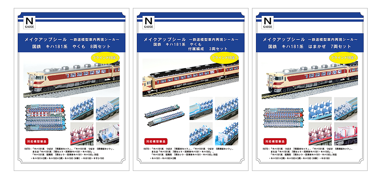 また、JR西日本更新色に対応した「キハ181系はまかぜ」を販売後、「やくも」と同じく国鉄時代の「キハ181系はまかぜ」対応のシール化についてお問い合わせをいただく事があり、今回、「国鉄キハ181系やくも」のシール製品化にあわせて、「国鉄キハ181系はまかぜ」も新たにラインアップ化するに至ったのでした。
