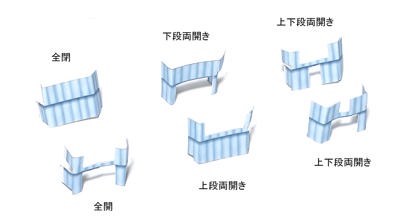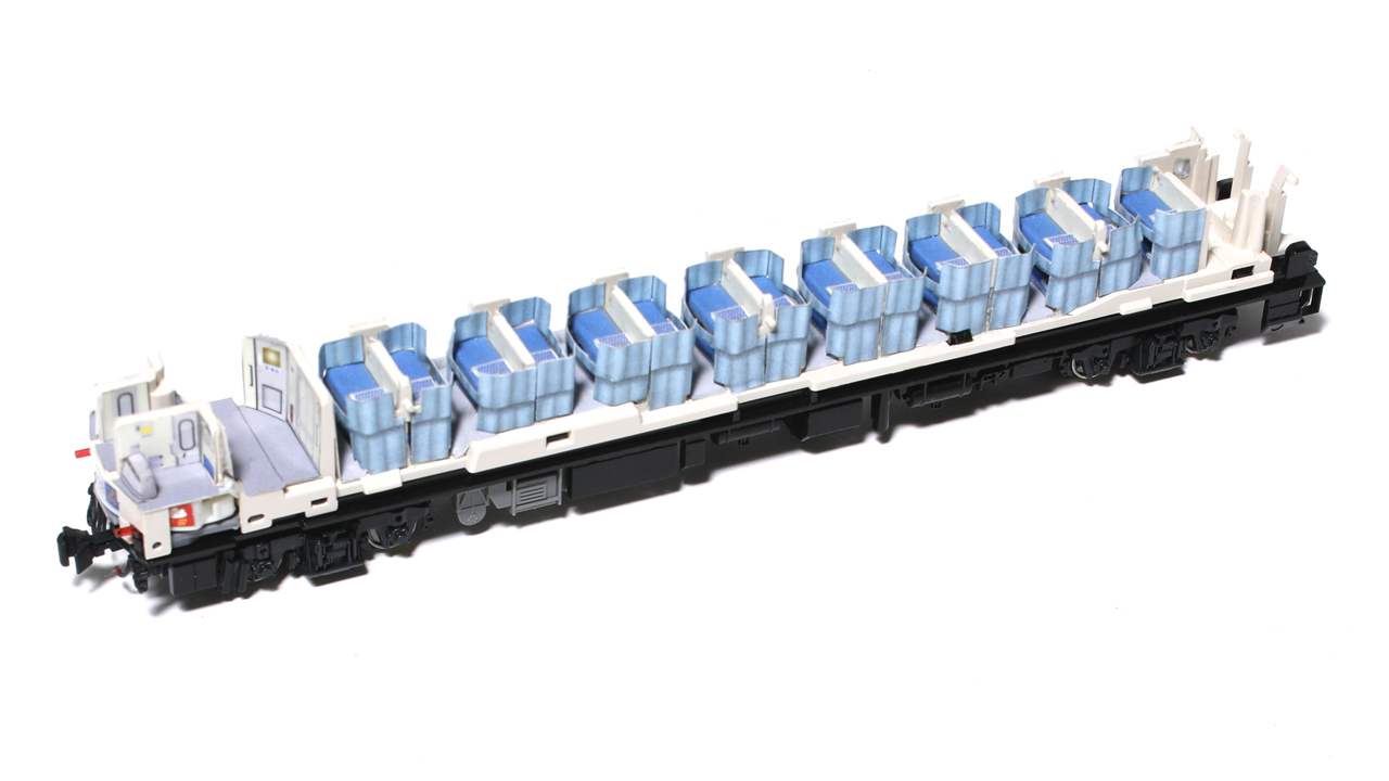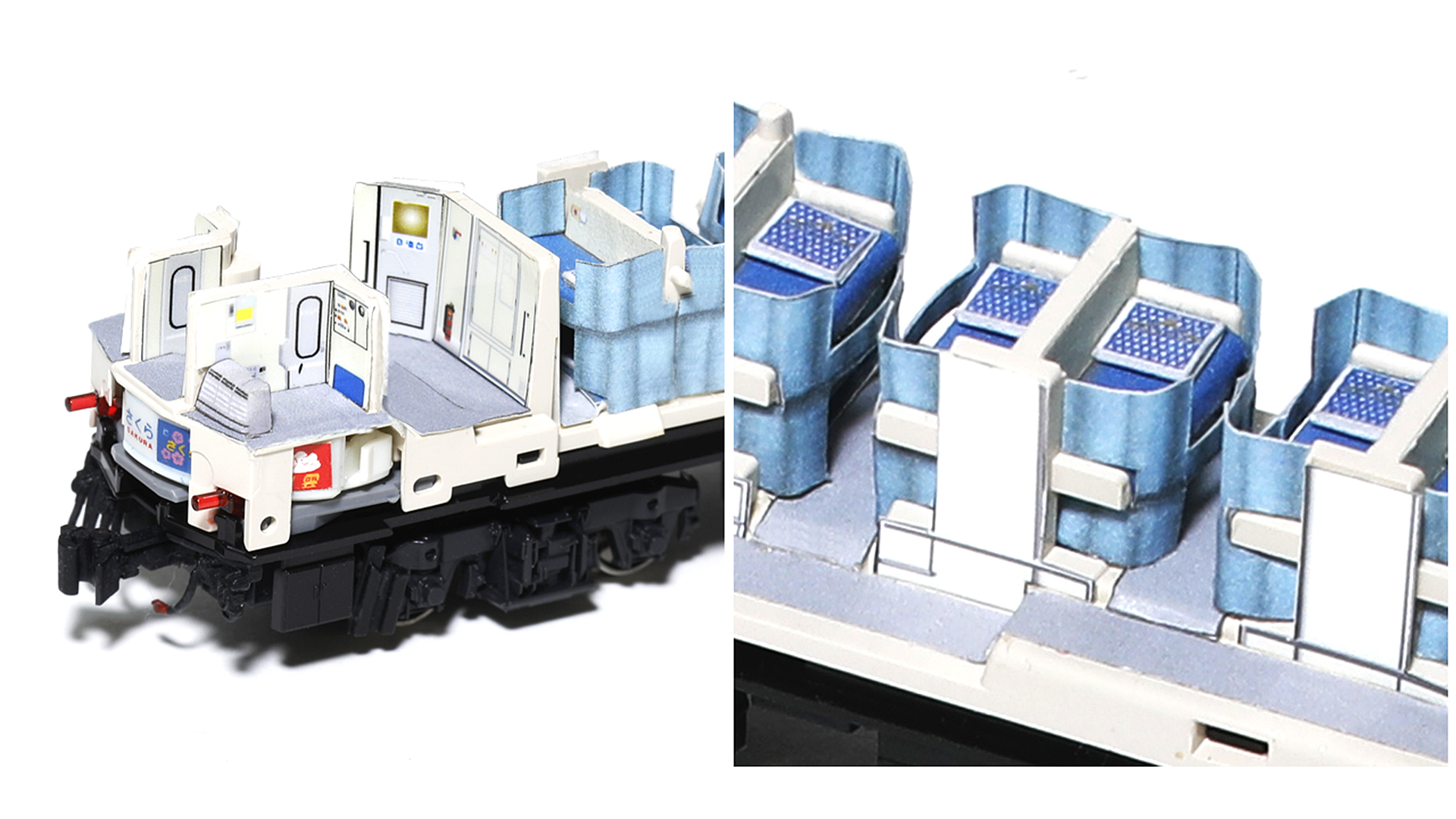 メイクアップシールのベッドカーテンは、下段上段にカットを入れることで、上画像のように全開、両開き、全閉と自由に再現することができます。基本的な使い分けとしては、始発駅、入線時は上下段ともに全開、寝台使用時は両開き及び全閉という使い分けになります。
