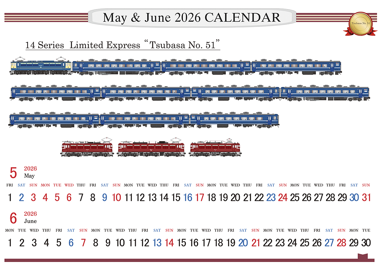 そして、カレンダー画像のイラスト編成図は「14系特急つばさ51号」です。