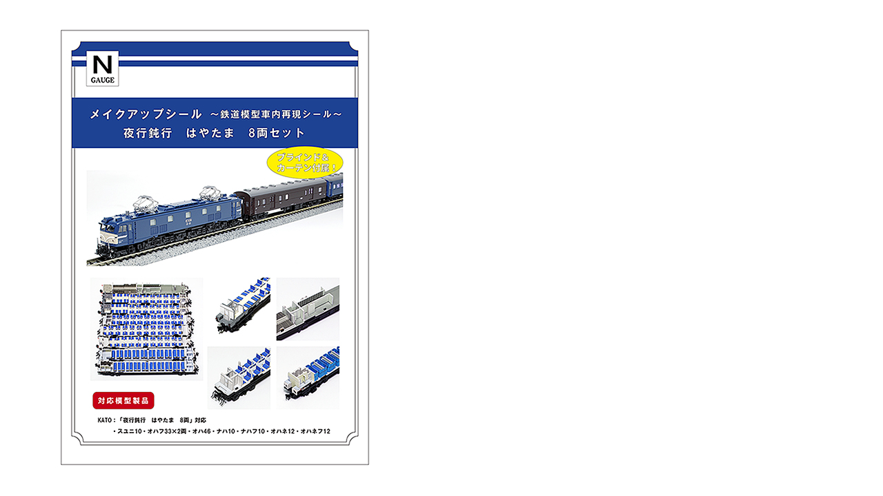 郵便荷物車スユニ61をはじめ、旧形客車、10系軽量客車、そして10系寝台車で構成された個性豊かなバリエーション編成が魅力的な「夜行鈍行はやたま」の車内再現をメイクアップシール「夜行鈍行はやたま8両セット」で是非お楽しみください。