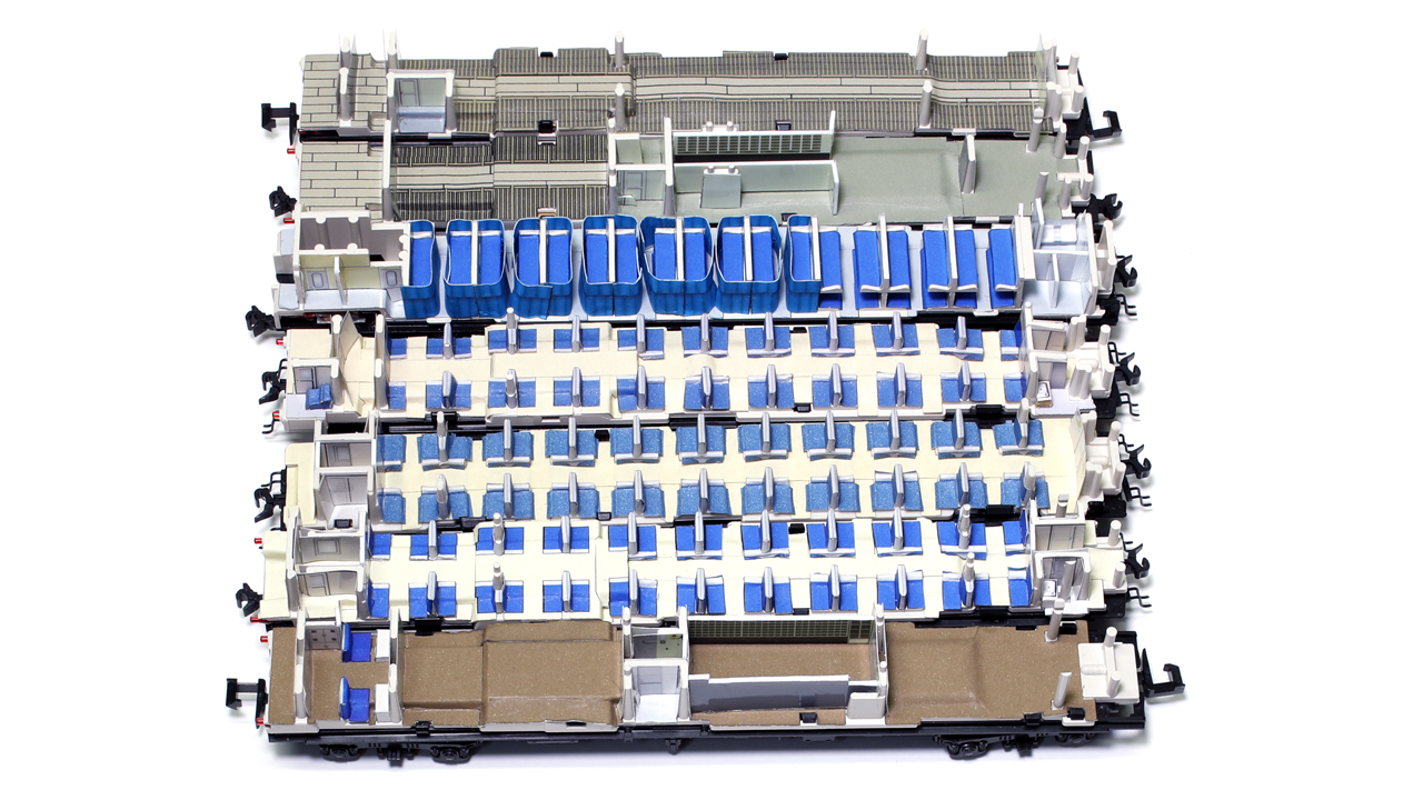 模型としては、オハフ45の100が初の製品化でした。一応スハフ42系に属する車両であり、基本的には車内の作りもスハフ42と近いものがありますが、先頭部分の壁面構成や部分部分でサイズの違いなどが見て取れます。